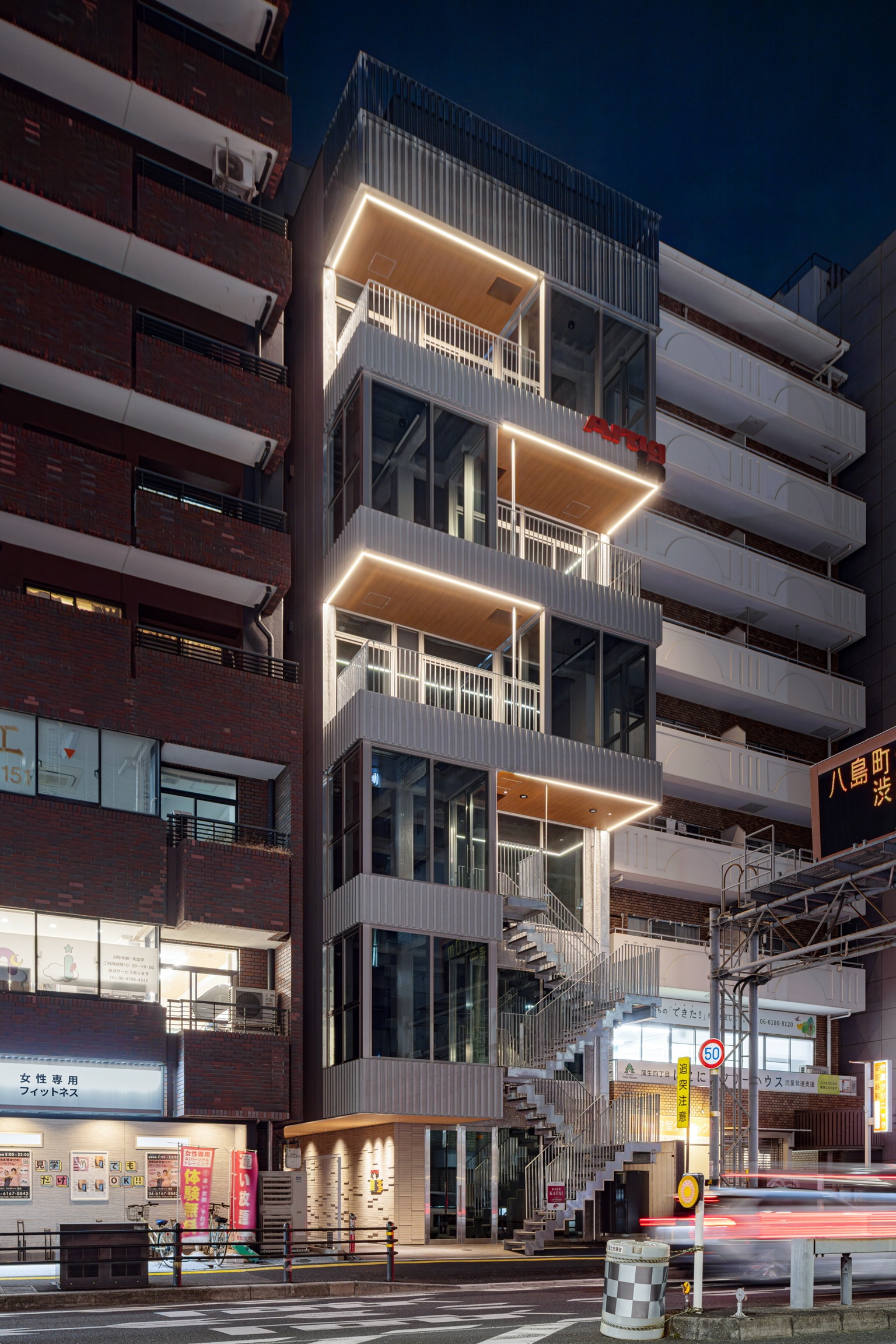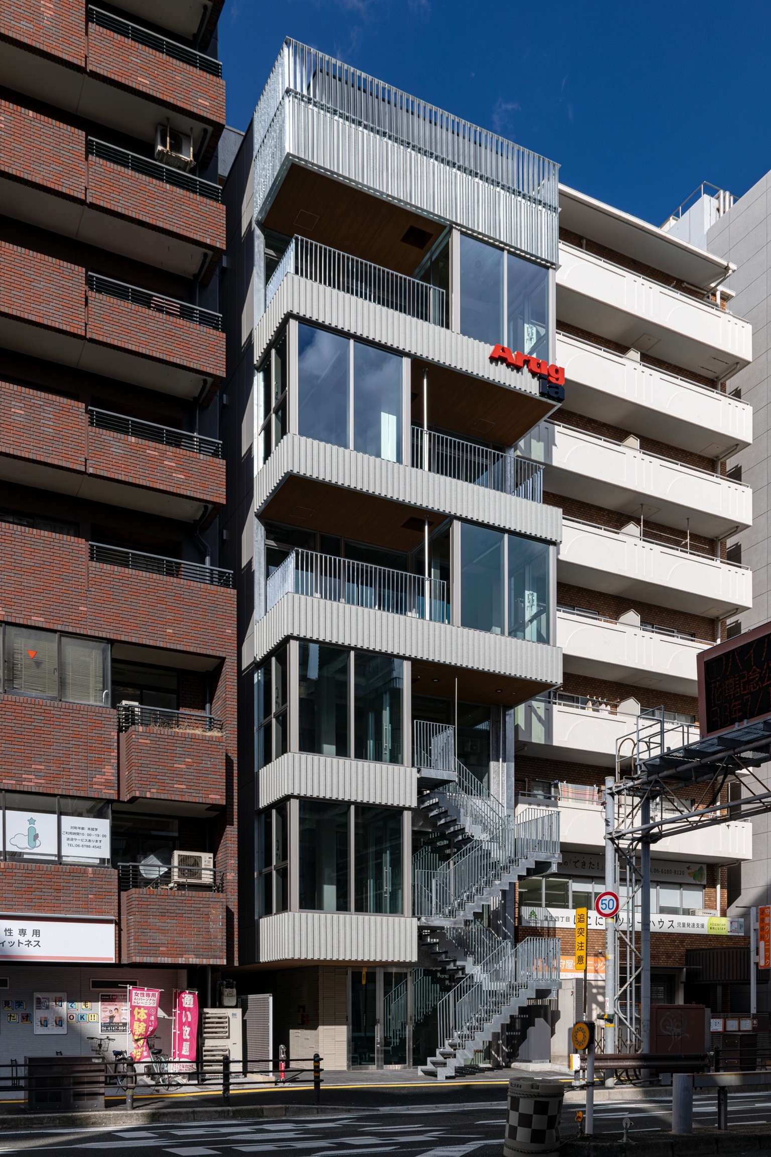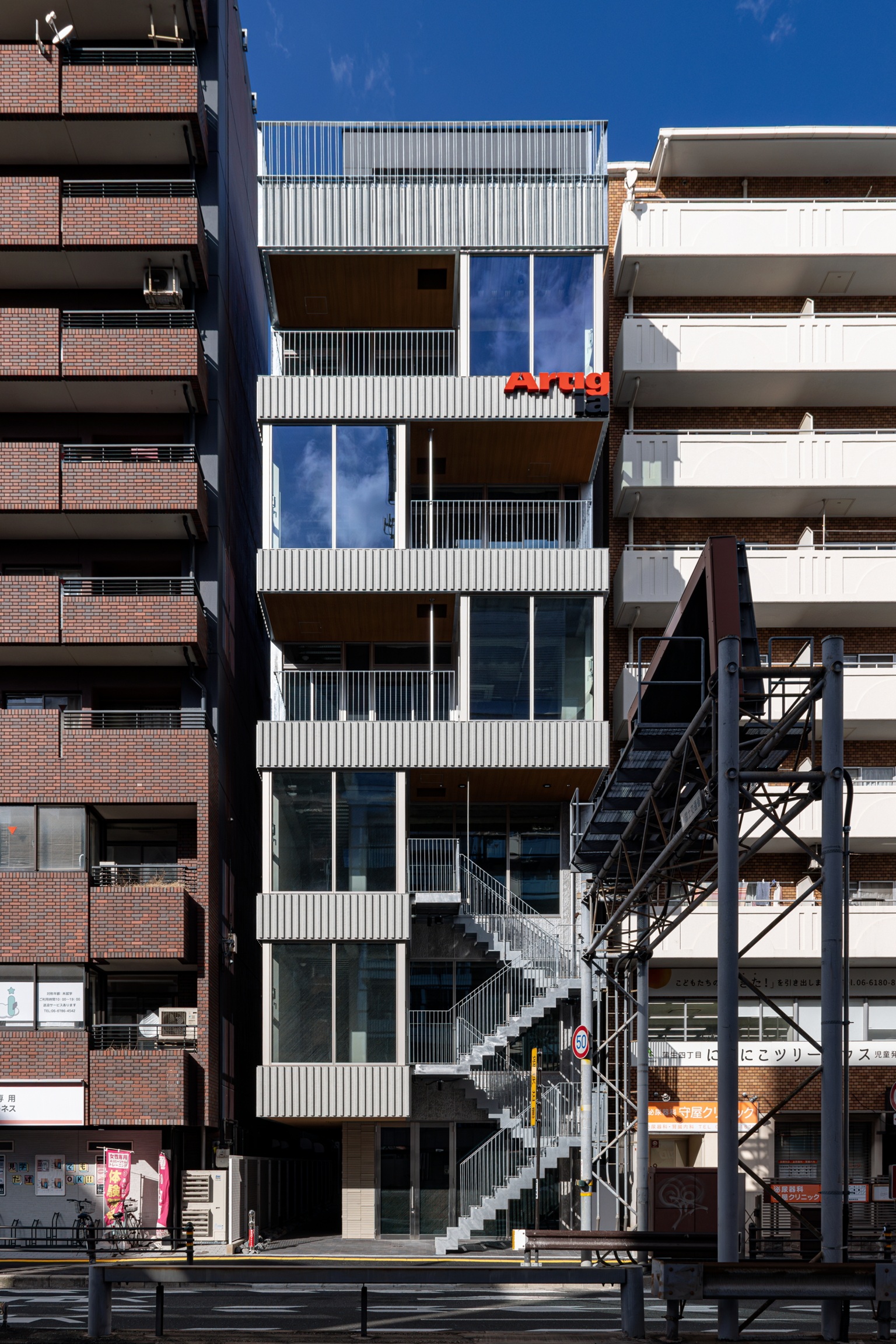 南面ガラス張りや外部階段・押出成形セメント板(東西面一部)が都会的で洗練された印象を与えます 。